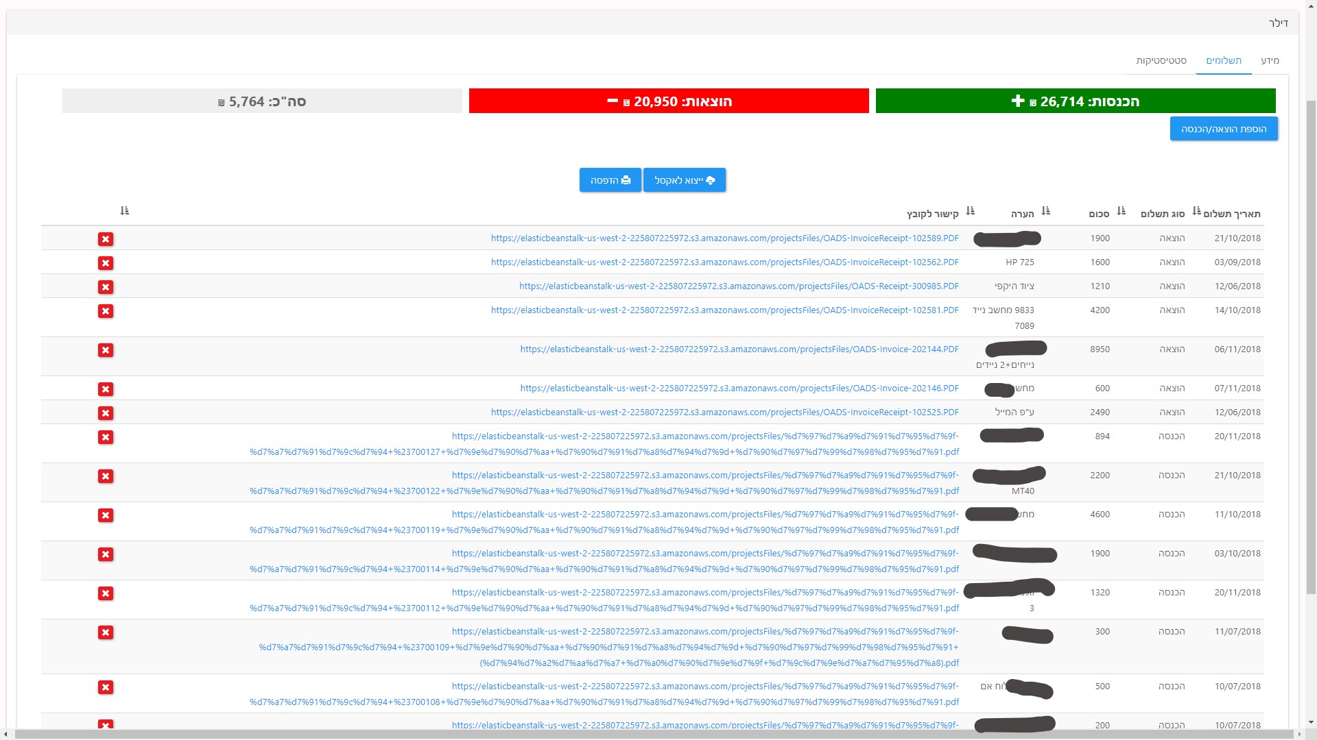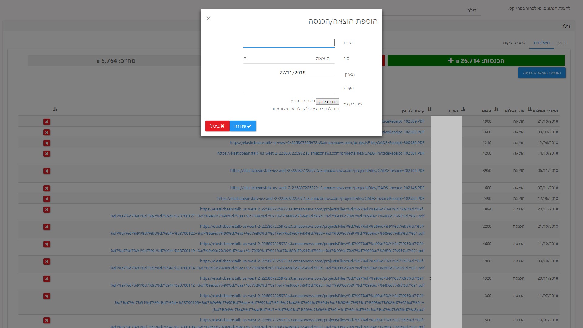 ניתן להזין הוצאות או הכנסות, להעלות מסמכים המתעדים אותם (קבלות וכדו'), והתכנה תציג לכם את סך ההכנסות וההוצאות הכוללות לפרוייקט, ואת המאזן הכולל של הפרויקט, כך שתוכלו להישאר תמיד עם יד על הדופק, ולראות מה מצבכם ביחס לכל לקוח ולקוח.